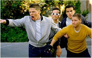 A screen-shot of Biff (B., aka Bill) and his pals. Biff encourages his mates to go after the probabilist-statistician P.G. (not in the picture), who ignored his veto. The guy (boy) with the white-rimmed sunglasses has been identified to be the well-known statistician of British descent R.D.G. (he seems unsure of whether going after P.G. is a wise thing to do; perhaps he is also thinking: “Biff is a very powerful guy, I have to think of my future”, see visit to the refuseniks, part 3).